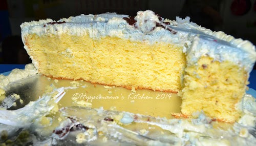 蛋糕体我使用了Masa老师的食谱,做了一点点更改,蛋糕成品摸起来是湿润软的,弹性也很够 (注:脱模和切片时摸的手感),不过吃进口里感觉有一点点粗粗的,唉~ 我对海绵蛋糕还是掌握不好。不过孩子们还是很给脸将整粒蛋糕吃到完,哈哈哈哈哈~ 我是有一点吓到,真的~ 蛋糕切开来才发现,河妈好吝啬哦,夹层的奶油完全看不到!哈哈哈哈哈~ 最近走健康路线有一点走火入魔,奶油涂太薄了。